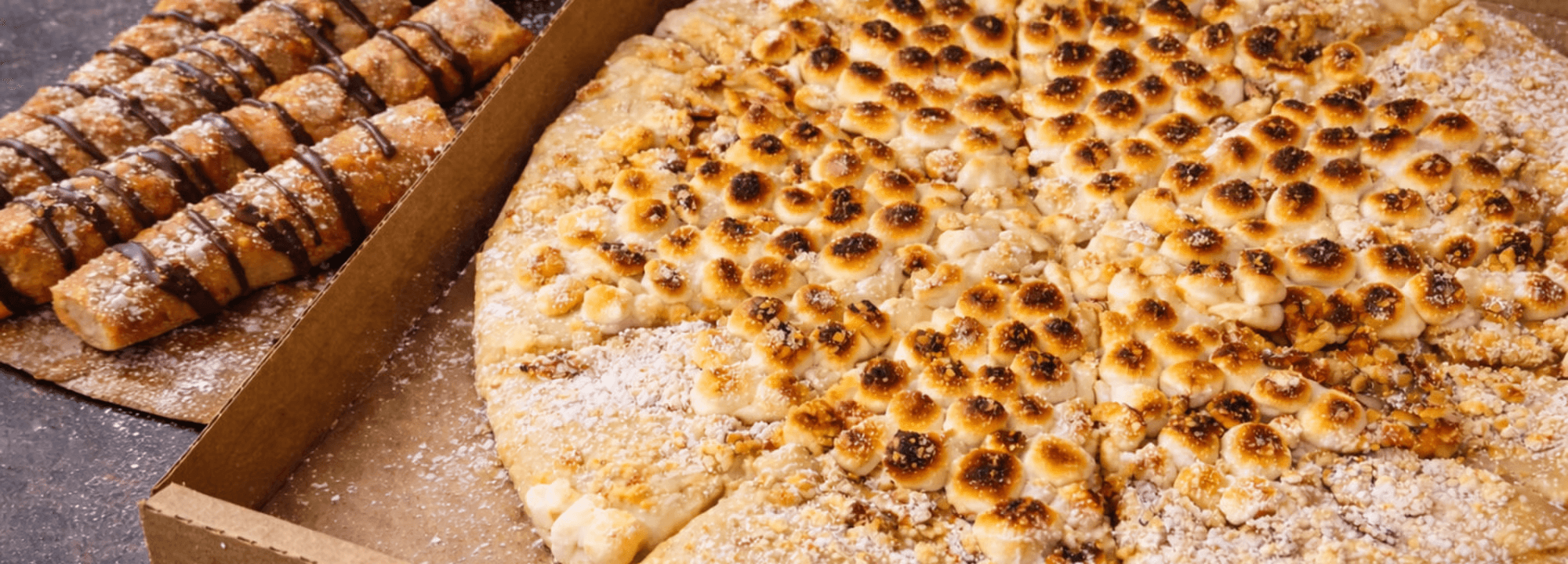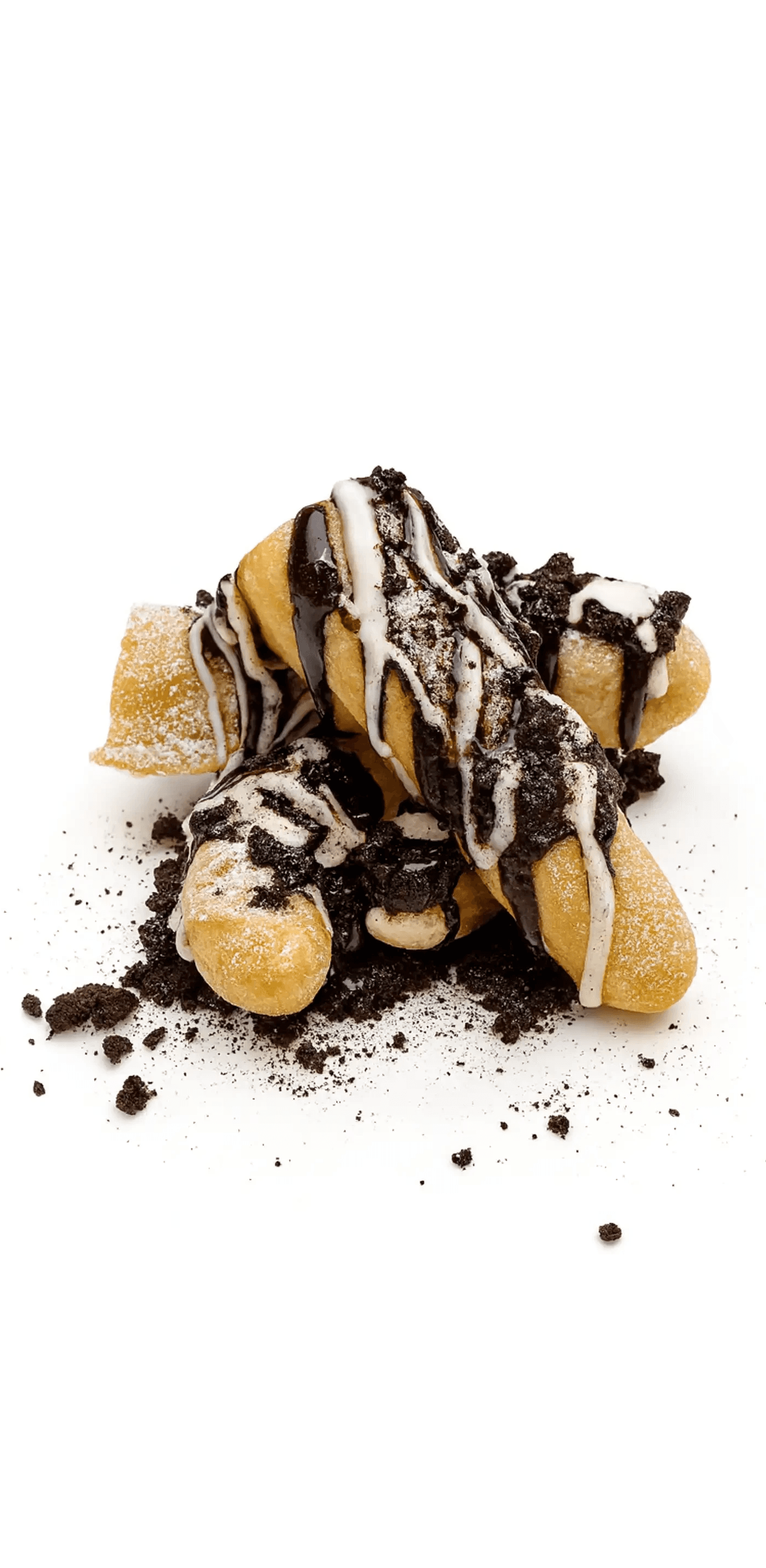 Warm Dessert Stix dusted with cookies & cream sugar, topped with Oreo crunch, and finished with marshmallow drizzle.